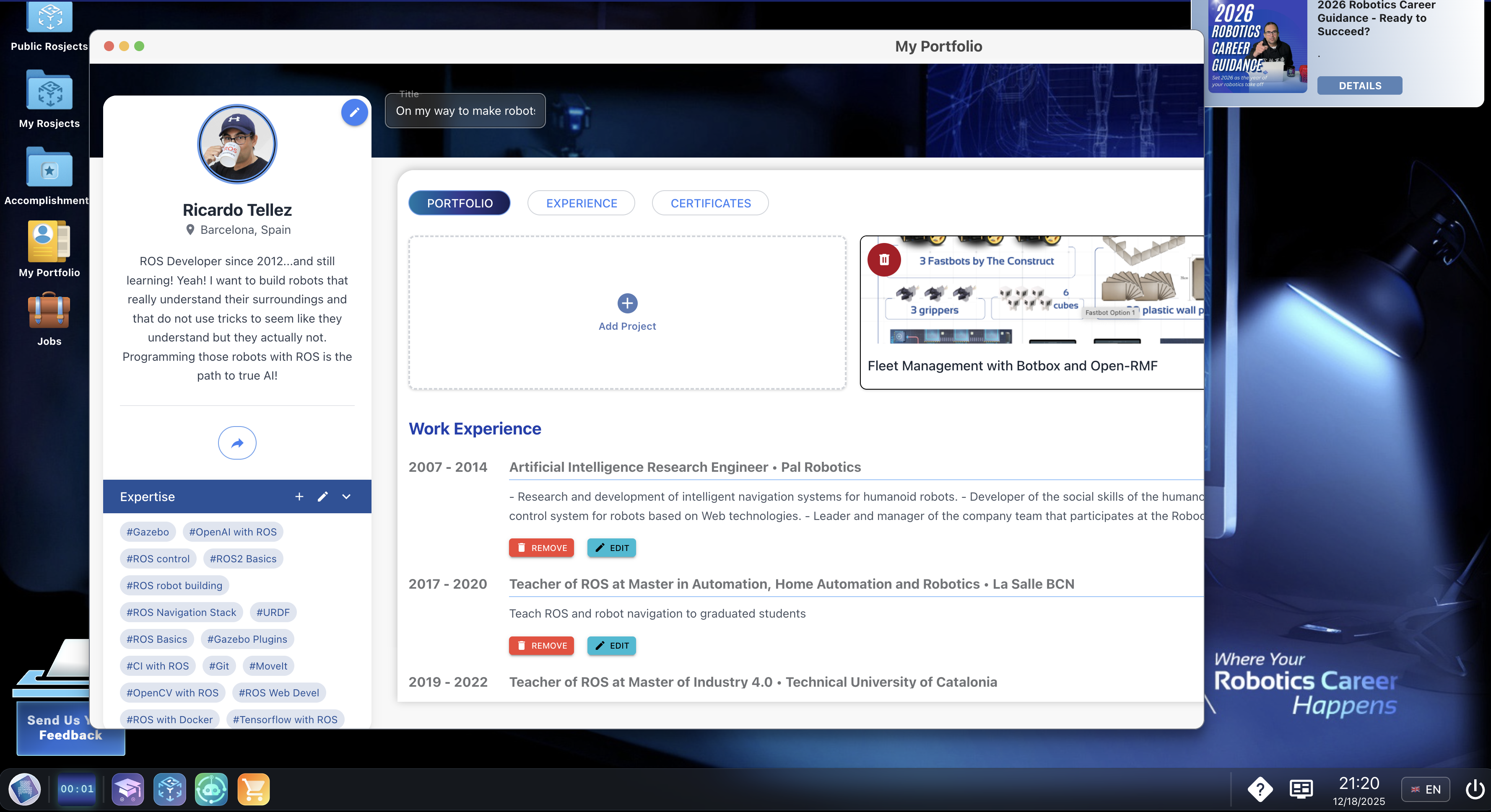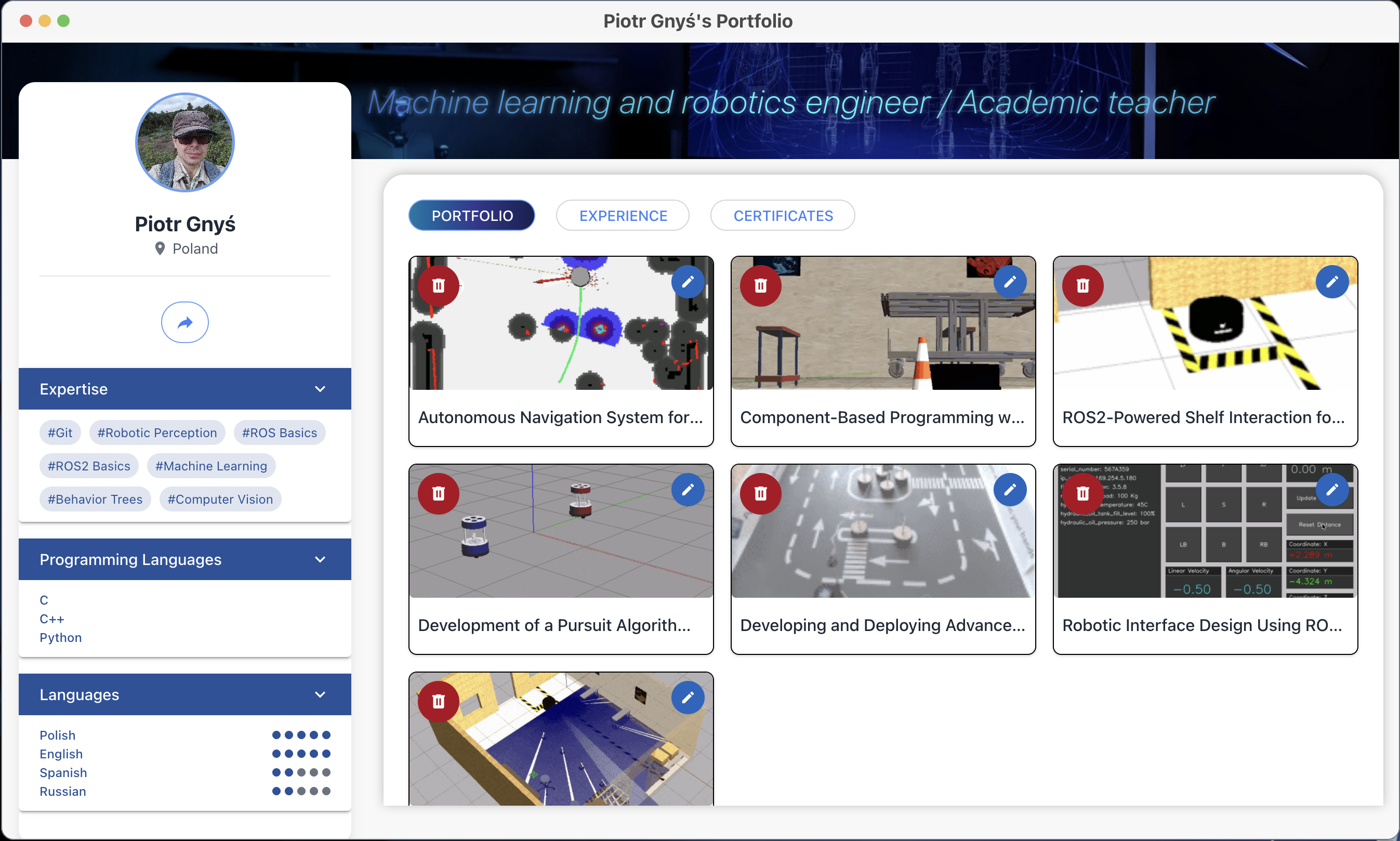 You can edit and fill the portfolio at will, but if you enrol in the Robotics Developers Masterclass, you will be doing awesome projects with simulations and real robots, and ALL THE PROJECTS ARE AUTOMATICALLY ADDED TO YOUR PORTFOLIO, including descriptions, links to code, and images.