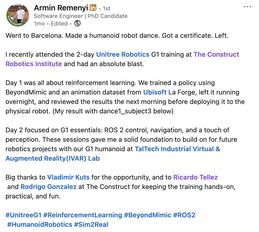 Work hands-on with real Unitree G1 Humanoid robot to solidify your learning.